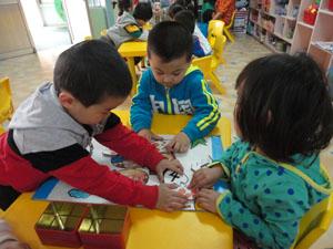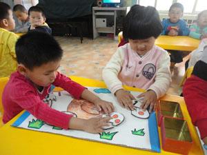 自制数学教具拼拼蛋宝宝,鸡妈妈的蛋为什么都少了一半,需要幼儿找到另一半,并且拼摆正确。锻炼了幼儿点数能力,让幼儿会根据鸡蛋上的数字去找点,或者根据出示的点的数量去找数字,锻炼了孩子的一一对应的能力。