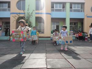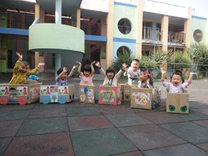 这是老师和孩子共同完成的教具,利用废旧物的纸盒,让幼儿把自己喜欢的作品来装饰自己的小轿跑,孩子们将汽车套在自己身上,瞧孩子们玩的不亦乐乎。