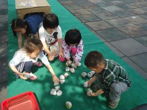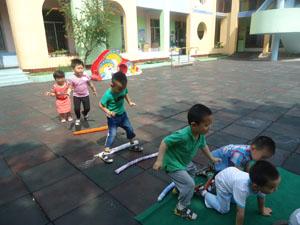 今天我们小三班的小朋友又扮演了新的角色——小松鼠,高高兴兴地为外婆送松果。我们跨过小河,钻过小山洞,然后想办法多拿几个松果,快速的跑到自己的外婆家,想办法为外婆多运些松果。瞧,我们多么能干呀!