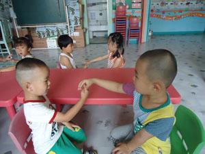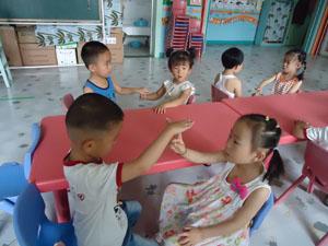 “淘米吆,洗菜吆,一把抓住老大吆!”今天我们小三班的小朋友一边唱着好听的《顶锅盖》,一边做着有趣的顶锅盖的游戏,我们有的小手当钉子,有的小手当锅盖,瞧我们玩的多开心啊!香喷喷的饭已经熟了,快来和我们一起做游戏吧!