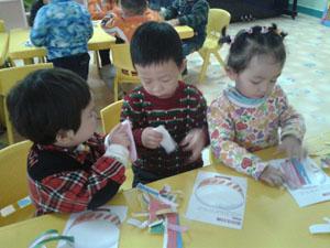 今天,老师教给我们做了一碗彩色面条。我先把彩纸剪成一条条,再用手揉搓成面条,蘸上胶,贴在大碗里,看,一碗五彩面条就做好了!