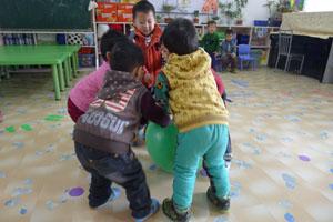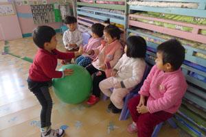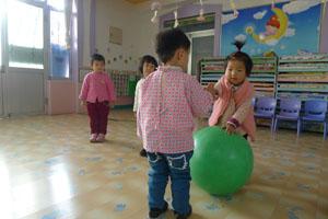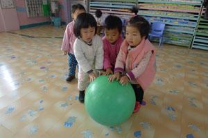 小五班的宝宝们玩儿滚大球呢!看看我们的大球一圈一圈的来回滚,宝宝们掌握的协调性还是不错吧!我们小五班的宝宝们很喜欢玩儿大球哦。