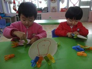 这里有一些过生日的蛋糕盘,宝宝们不光会在上面作画,还会探索装扮小盘子呢!快看宝宝自己结合用具探索出来的办法。(刚开始有的宝宝用夹子夹手指,还有的夹子夹子互相夹,还有的排排对,最开始想起夹子夹作品的是博涵,小宝宝们相继效仿。)