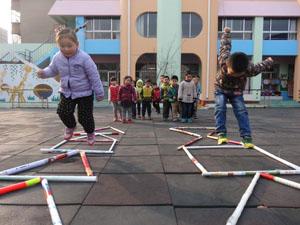今天我们的户外游戏是好玩的小棍,我们将小棍拼接成了好多形状进行双腿跳房;小朋友之间合作用小棍玩拉大锯的游戏;小朋友还将小棍立起来变山洞,让小朋友来钻;还能将小棍连接起来,拼出了好多不同的图形;小棍原来还有这么多的玩法啊。