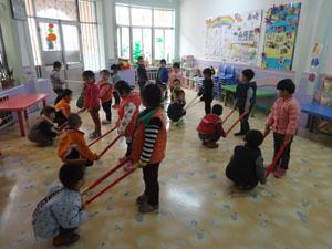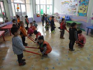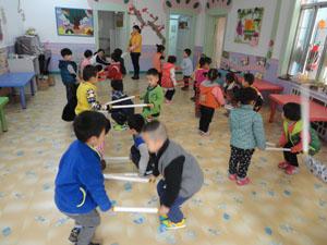 现在天气太冷了,有的游戏在户外玩会冻坏的。可是小一班的我们真的很想玩好玩的跷跷板,所以老师就给我们组织了这个“好玩的跷跷板”游戏。我们用金箍棒当跷跷板,我们自己当翘板两端的椅子,而且还是“全自动”翘起来或者是翘下去的,哈哈,太好玩了。