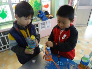 今天张老师带着我们一起制作了漂亮的瓶子,材料很多,有塑料瓶,玻璃瓶,牛奶瓶,花瓶,还有很多漂亮的丝带,装饰起来可漂亮啦!小朋友们都很棒,在老师的指导下亲手制作。瞧!我们的作品是不是很漂亮啊!