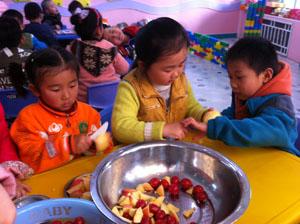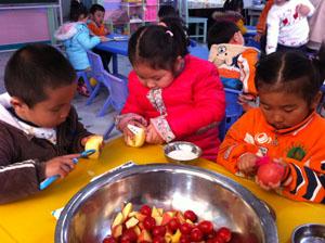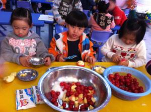 今天我们中三班的小朋友们利用现有的水果一起制作了一道清凉爽口的小菜,这可是我们的拿手小菜,我们亲自动手将水果切开﹑削好,拌上糖﹑酸奶,一盘可口的水果凉菜就做好了。小菜真的好美味呀,快来尝尝吧!