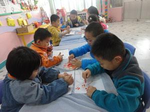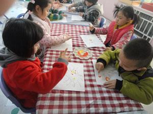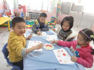 “桃花瓣,一朵朵,开满树,连成片”。今天我们中三班的小朋友们用手指蘸取水彩作画的方式来画桃花。我们先蘸取黄色的颜料做花心,然后蘸取红色颜料用手指点成5朵花瓣。看我们做得多漂亮啊,快来参观我们的桃花展吧!