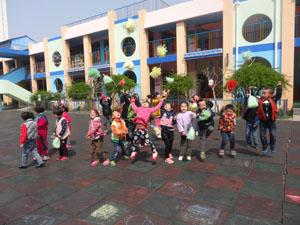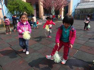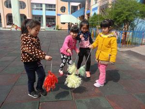 春天的阳光非常的好,阳光照在身上暖洋洋的,小朋友们在院子里踢毽子,每个小朋友都拿着一个毽子,你也踢一个,我也踢一个,有趣极了!瞧,鱼宝他们踢的还不错呢~~真好!