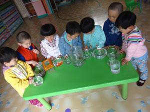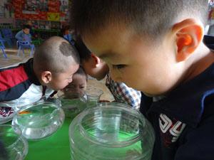“看看我的小鱼还好么”?“咦?它怎么了”?“螃蟹睡着了,我们轻轻地看,别吵醒它了”。“可是我想和它玩会儿,我们都起床了它们也要起床了,喊喊它吧”!“小螃蟹,小螃蟹快醒醒,起床啦”!“小乌龟,小乌龟醒一醒起床啦”孩子们在观察角你一言我一语的讨论着。
