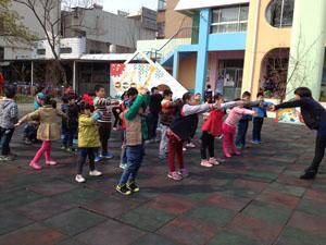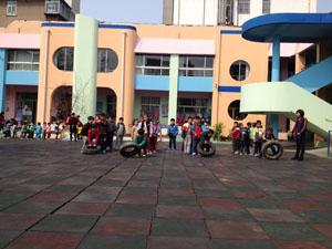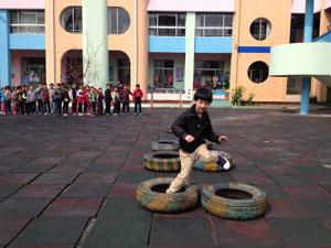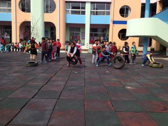 轮胎有好多好玩的玩法,可以滚着玩,可以设置障碍进行跨跳,可以用轮胎来装载东西,今天我们大四班小朋友要用轮胎来比赛,我们要将轮胎翻滚到终点,再将轮胎滚着回到起点交给第二个小朋友,最先完成的一组获胜。