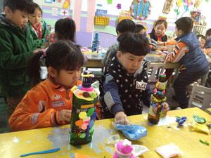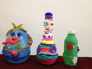看我们装饰的酒瓶美吗?我们将太空泥捏成好多漂亮的图形粘在酒瓶上,还可以将太空泥滚成条状给酒瓶穿上漂亮的衣服,我们大四班小朋友很厉害吧……