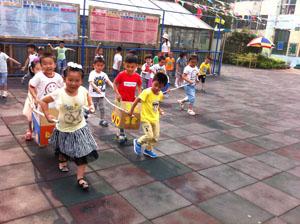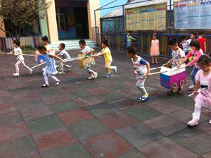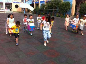 今天我们中三班的小朋友们玩了一个好玩的游戏——抬花轿。我们三人一组,在纸盒前后各一人,手抓纸盒两边的纸棒,一人在纸盒中间,三人一起配合快步走到规定的地方,看哪组走的又快又稳。看我们玩得多开心啊,快来跟我们一起玩吧!