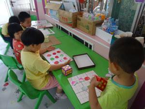 又到区角活动时间了,这一次我们来到了益智区,我们一起玩起了九宫格的游戏,先是掷骰子,然后根据骰子的个数取出自己喜欢的图片(西瓜、草莓、桃子)逐个放到小方格里,看谁先填满空格,看我们多么认真啊!
