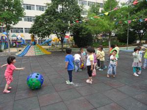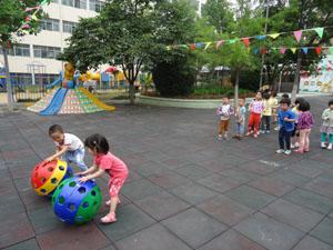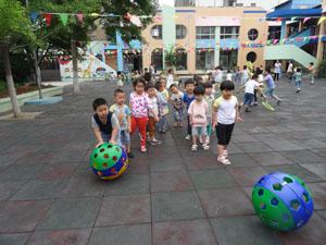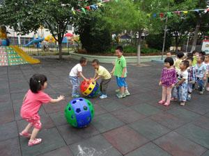 今天的天气不错,好凉爽啊!我们小二班的小朋友一起玩起了洞洞球,彩色的小球滚呀滚,我们在后面追呀追,哈哈,洞洞球等等我,我马上就会追上你!我们在一起好开心!