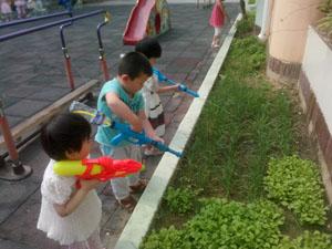 天气逐渐炎热起来,在这个季节水枪是我们小朋友最喜欢的玩具,我们可以展开一次刺激的水枪大战,也可以用水枪帮助小花、小草浇水,让它们也享受水带来的一丝丝的清凉! 通过户外活动《好玩的水枪》不仅锻炼了幼儿手的握力,而且也能让小朋友用高兴、开心、有趣等词汇表达玩水枪的愉快心情。