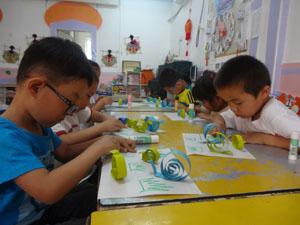 纸条纸条变变变,变出快乐的小蜗牛,我们用纸条卷成蜗牛的身体,用油画棒添上嫩绿的草坪,快乐的小蜗牛就出现了,你也想试一试吗,让小蜗牛背上房子去旅游喽。