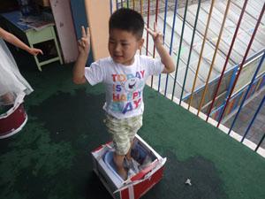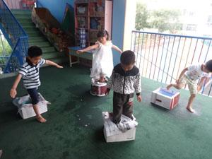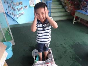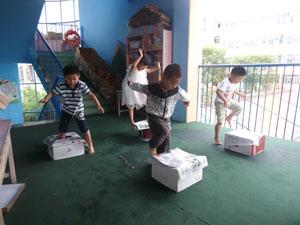 老师为我们准备了神秘的大盒子,里面藏着未知的秘密,我们准备好之后蹦的老高,用力一跳,哇~有的小朋友落到了箱子上,有的小朋友却踩到了地雷,哈哈哈,看我们玩的好开心啊,我们是勇敢的小朋友。
