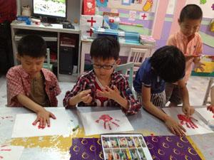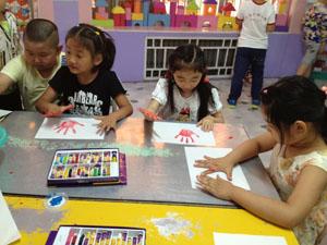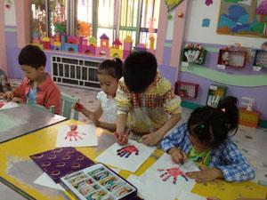 我们的小手真灵巧,会写字来会画画,今天我们大四班小朋友要用我们的小手进行画画,老师告诉我们这样的画法叫做手型彩绘,我们要用小手的形状画出大树,画出孔雀,画出美丽的图画,哇!我们的小手真能干。