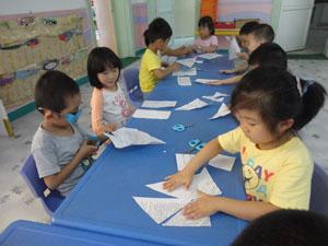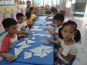 “正方形,变变变,变成蝴蝶飞飞飞,变成小鱼游啊游”。今天我们中三班的小朋友们用折、剪的方法将正方形变成其他图形,然后用拼合的方法将不同的图形拼成各种新图形,小朋友有的拼成小鱼,有的拼成小花。看我们拼的多像啊,快来一起拼图吧!