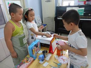 瞧!他们这是在做什么呢?好玩的超市游戏开始了!这个是大二班的孩子们最喜欢的游戏,大二班的孩子们可以根据自己的喜好来扮演顾客、售货员和收银员进行游戏,让孩子们了解了10内钱的换算关系,加强了合作能力初步开启了孩子们的社会性的锻炼。