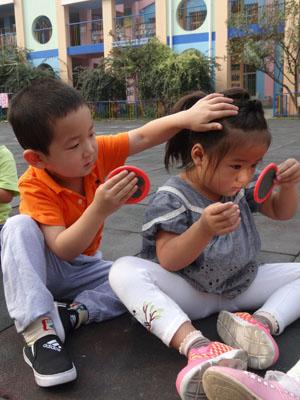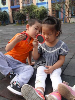 “咦?里面有什么?”刚刚进科学发现室晓儿指着说道。“我认识,我认识它是镜子”宁宁边说边拿了一个照了起来。孩子们看到宁宁在照镜子,纷纷选择了一面自己喜欢的镜子照了起来。孩子们一边照镜子一边聊天,“看看我的镜子里面有个你”宗泽对着彩宝说道。彩宝:“看我的镜子里也有你。”另一这边陈宇泽摸着妮妮头说“你看看我的镜子里有你呢?”妮妮拿起镜子说“这不是你吗?”两个小朋友你看看我,我看看你哈哈大笑起来!