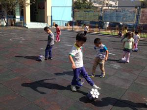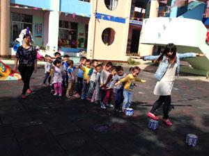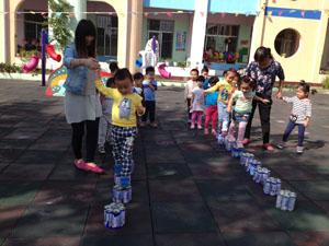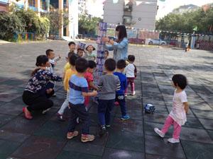 小小梅花小小桩,健康身体需要它,走小河,过山坡,健康快乐多又多,小朋友们你们看,我们小三班小朋友们一起玩梅花桩。看,我们还可以用梅花桩建高楼,还可以当球踢,想想看还可以怎样玩?快来告诉我们吧?