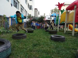 今天大二班的小朋友来到户外草地上,玩了一个《鲤鱼跳龙门》的游戏,小鲤鱼们历经各种关卡