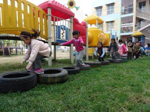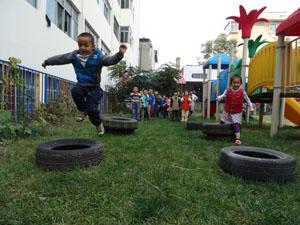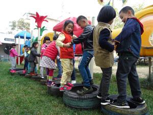 相互合作,最终在龙门处来了一个漂亮的一跃,完成游戏,本游戏锻炼了幼儿面直视困难勇于奋进的精神,以及互相合作的集体感。
