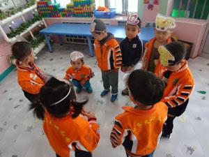 小一班的小朋友带着不同动物的头饰围成一个圈,他们在干嘛呢?听~“小白兔蹲,小白兔蹲,小白兔蹲完老狼蹲”小白兔边蹲边说。老狼接着说:“老狼蹲老狼蹲,老狼蹲完小鸟蹲。”哈哈!原来他们在玩动物蹲的游戏!看谁的反应最灵敏噢!