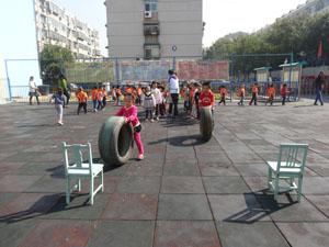 巧滚轮胎,幼儿自由探索轮胎的多种玩法,提醒幼儿在不同地面上滚,如在平地上滚、在坡地上滚,寻找滚轮胎的最好方法;保持轮胎直立,扶正轮胎向前滚动,你瞧!我们中班的小朋友玩的多开心啊!