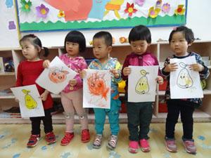 大家快来看,这是什么?对,是酸酸甜甜好吃的水果。吃水果对我们身体有好多的益处呢,补充各种维生素还让我们女孩漂亮,男孩高高帅帅,我们都要多吃水果啊!看!我们还给水果宝宝涂上了漂亮的颜色。