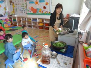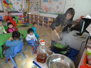 我们小六班的小油菜收获了,快来看看我们在做什么?对了,海米炒油菜。首先我们准备了一些需要的食材,哇!油热了,可以炒了,都闻到香味了,馋的我们流口水了,老师快给我们尝尝吧,真好吃,老师我还想吃!