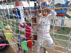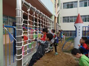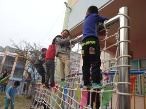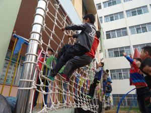 攀爬是一项勇敢者的运动,我们大二班的小朋友都很勇敢,小手紧紧抓住攀爬绳,小脚用力向上攀爬,勇敢的爬到最上面,有的小朋友还变换路线横着攀爬、S型攀爬等,这项运动锻炼幼儿的四肢协调运用和手臂、腿部的力量。