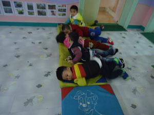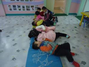 看看小一班的小朋友们在做什么?哈哈,我们正在玩儿游戏《身体骨碌碌》是不是很有意思。我们的身体可以骨碌碌,瞧!在地垫上我们可以滚来滚去,我们的脖子、手腕、脚腕……各个关节也可以做骨碌碌的运动。快来活动下吧!