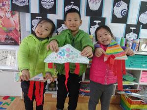 今天我们大二班的孩子们在制作风筝,首先他们带来了自己最喜爱的风筝,各自介绍着自己风筝的特点,之后他们用不同的材料来制作风筝,在仔细观察了风筝的构造之后,大家就大刀阔斧的开工制作了!最后在一起合影留念。