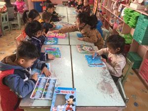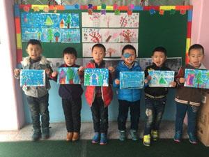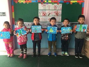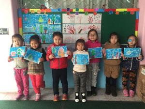 今天大三班的小朋友学习了油水分离的简单技巧,感知油水分离画的奇妙。大家利用彩色油画棒画出树、房子以及厚厚的白雪,用刷子在整幅作品上涂刷蓝色水粉。神奇的效果出现了!看,一幅一幅的雪山美景!
