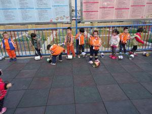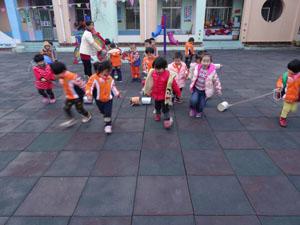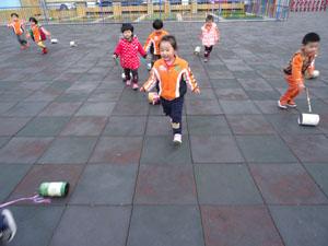 小小筒滚一滚,小朋友们拉一拉,看我们的爸爸妈妈用喝完的奶粉罐、茶叶罐等等生活中的圆柱体为小朋友们做的小拉筒,陪我们走,陪我们跑,快看是哪位小朋友的小筒朋友跑的快,快来和我们小三班的小朋友一起去追着风儿跑起来吧。