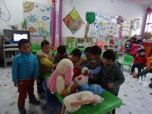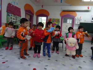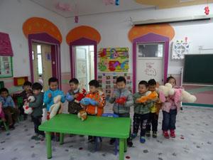 今天我们来比赛,说说我的动物好朋友----毛绒玩具,有小狗,小猫,小白兔,小牛,小老虎,小燕子,还有可爱的小鸭子,今天我们一起和动物做朋友,看同伴间分享介绍自己的好朋友。好多同学都找到了新朋友,一起来唱朋友越多越快乐吧。