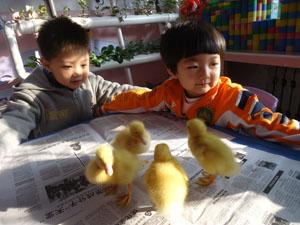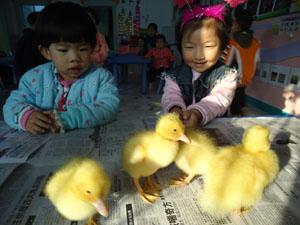 观察小鸭:嘎嘎嘎!毛茸茸黄橙橙,一摇一摆不倒翁。小一班的小朋友们在班里围观欣赏,扁扁的嘴巴;长蹼的脚丫;好奇的眼神;跌跌撞撞的脚步;跌倒了却努力翻爬起来赶紧追同伴;吃食时征占食具的霸道;饭后集聚在一起嘎嘎嘎的私语;不时挠痒痒的憨态让孩子们从倾听到实际观察相结合。对记忆有了更加深的认知,看到孩子专注的眼神融在欢喜的活动中——真美!!