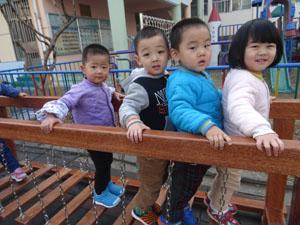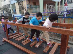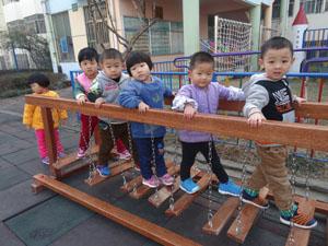 快来看我们幼儿园来新玩具了,你们知道是什么吗?它的名字叫惊险荡桥,你上来试试就知道了,果然名副其实,站上去晃晃悠悠,惊险无比啊!刚开始还有点害怕呢,不过我们是勇敢的小宝宝,在老师的帮助下,我们排队一次上桥体验,哈哈!欢迎你们也来挑战!