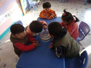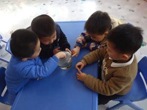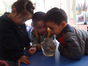 快看快看,摇摇头,摆摆尾。红的,黑的花的小金鱼多可爱啊!突出的大眼睛,不停一张一合的嘴巴,是在说话还是在告诉我们它饿了?小一班的宝宝们看的认真,不停的小声交流着。老师适当地进行引导:小鱼困了怎样睡觉?为何它不眨眼睛?它用什么呼吸?鱼儿胆小我们应该如何照顾管理呢?孩子们小声唱着《小鱼游》还用肢体模仿游泳的动作——真美!!