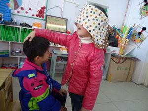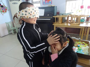 今天的游戏孩子们非常喜欢,游戏名字叫做“盲人摸象”,选中的小朋友蒙上眼睛,原地转三圈,进行盲摸,来说出小朋友的名字,小朋友们都有自己的技巧,先摸头发这样可以确定男孩女孩,再摸衣服,有的小朋友闻一闻味道就猜出小朋友的名字了。此活动锻炼幼儿手的触感,还可加深小伙伴之间的友谊。