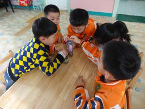 今天大三班的小朋友在阅读了《乌鸦喝水》的故事后,通过自己动手实验操作验证故事的结果,初步感知瓶子里水位高低变化与水量和石子的大小、数量的关系,相互体验合作的乐趣。培养了幼儿探索、创新的能力,激发了小朋友进一步探究的愿望。