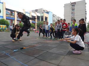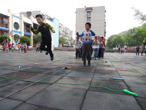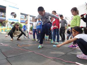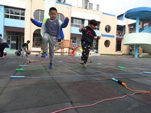 孩子们正在练习双脚跳跳绳的活动,突然有个孩子说:“我们用跳绳跳竹竿舞吧。”于是老师与幼儿合作,有节奏的将绳子进行开合,让孩子们进行跳竹竿的游戏,孩子们找准时机通过障碍。此活动锻炼了逻辑思维能力和身体协调能力。