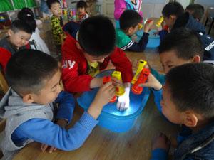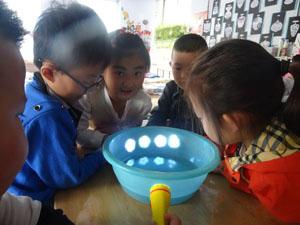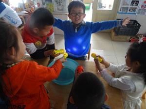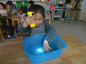 本次科学活动《猴子捞月》,孩子们把手电筒的光照在水面上,比喻成月亮,好奇的孩子们用小手去捞,把月亮捞的很碎,一会月亮又形成了。孩子们利用折射的原理在水面上创造出两个月亮。此活动锻炼了幼儿的动脑能力和创新能力。