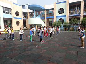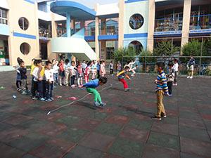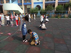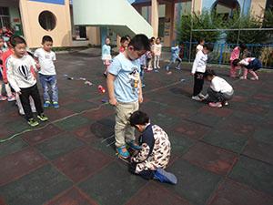 今天大三班的小朋友学习立定跳远的动作技能,发展了双腿弹跳的能力,在掌握动作要领之后,小朋友们进行了跳远比赛,瞧,还有专门成立的距离测量员,起跳线与落地后脚跟的两条线就是跳的距离了!小朋友们体验了其中的乐趣。大家玩的好开心呀~