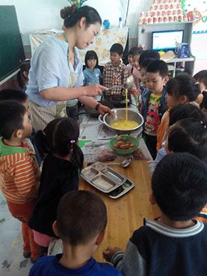 阳光明媚,小朋友们来到菜园带菜椒宝宝回家啦,又绿又大的菜椒宝宝正在向我们招手呢。你一个我一个,先给菜椒宝宝洗洗澡,哇,好干净!今天老师说菜椒宝宝要和鸡蛋宝宝还有肉宝宝做朋友,洗洗手,摘摘菜,切一切,炒呀炒……好香呀,啊呜!大口吃起来。