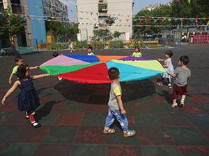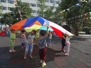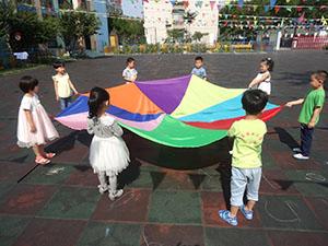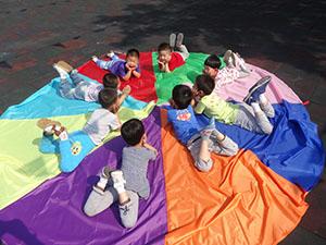 哈哈!看到这个大伞是不是很惊讶啊!这是我们小一班小朋友今天要玩的七彩伞,让我们一起动起来吧!来个圆圈转转,七彩伞在小朋友的帮助下飘起来了。只听哗啦啦!下雨啦,小朋友们立刻转进伞里面。一二三天晴咯!大家一起举高,瞬间变成一个遮阳伞。是不是很有意思啊!既锻炼了身体协调性还帮助我们感受集体的力量,增强集体荣誉感和身体素质。累了趴下休息一下,闲来没事儿我们聊个天吧!
