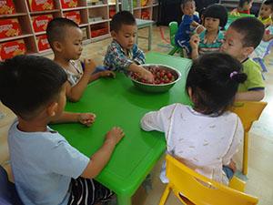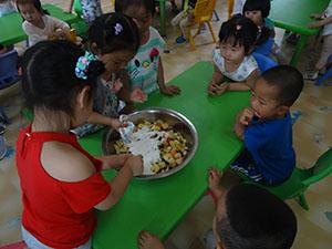 布置“好吃的水果”主题,教师准备常见的水果照片粘贴在墙上,通过活动“制作水果沙拉”让宝宝们帮忙做清洗工作,并和教师一起制作并品尝。哇!味道好棒啊!